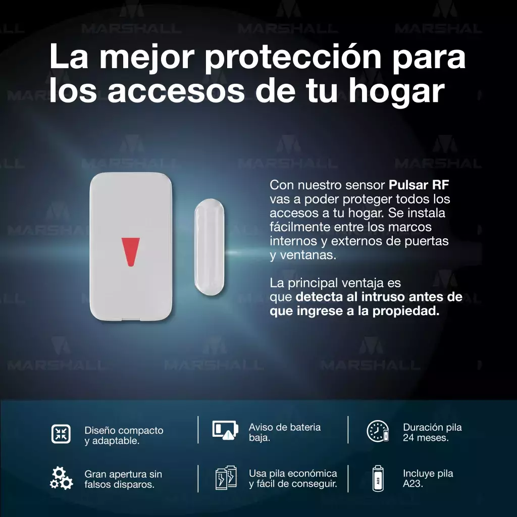 Con el sensor magnético Pulsar RF de Marshall vas a poder proteger todos los accesos a tu hogar. Se instala fácilmente entre los marcos internos y externos de puertas y ventanas.